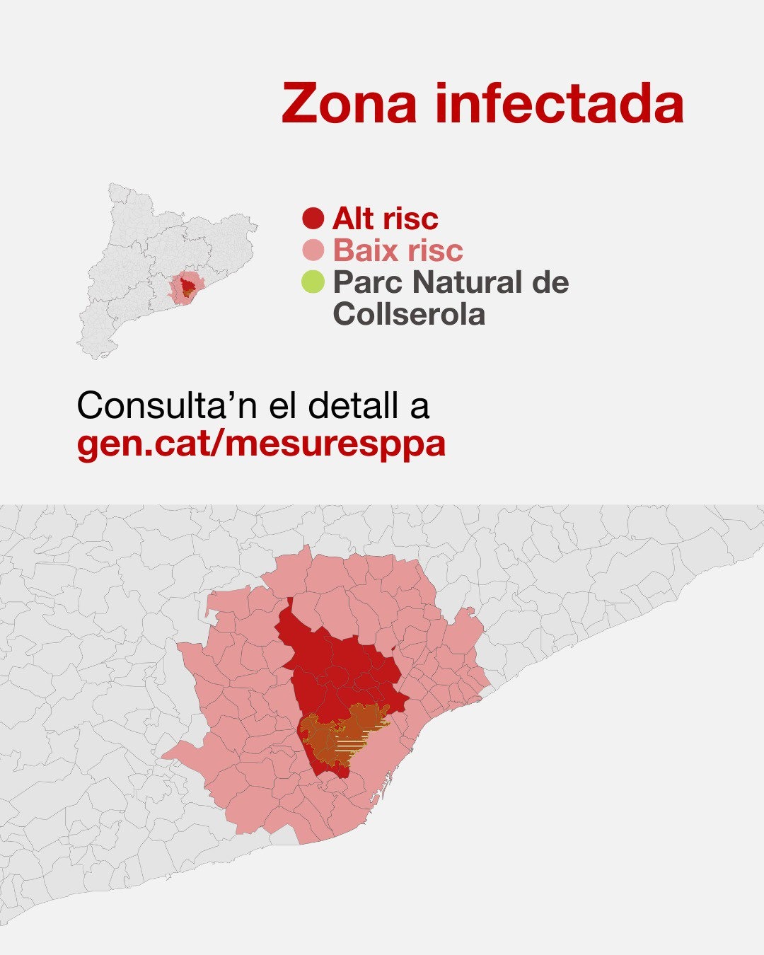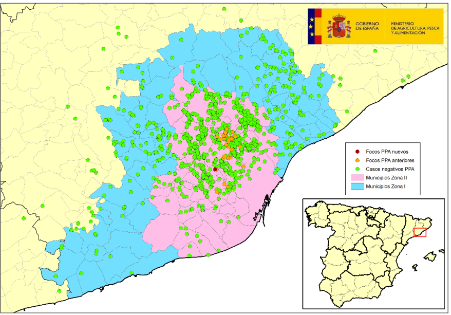 El mes de noviembre, la Generalitat cerró la zona más cercana al punto de afectación, un radio de 6 km, que incluyía a 12 municipios. El 17 de febrero se incorporó un municipio más, Sant Feliu de Llobregat, y una pequeña parte del término municipal de Barcelona (la zona montañosa de “Can Castellví”) después de que se detectara un caso positivo de PPA en la localidad. El 12 de marzo, la Generalitat anunció el cierre del acceso al Parque Natural de la Serra de Collserola, que es limítrofe con la ciudad de Barcelona, tras la detección de nuevos casos positivos dentro de su término municipal.