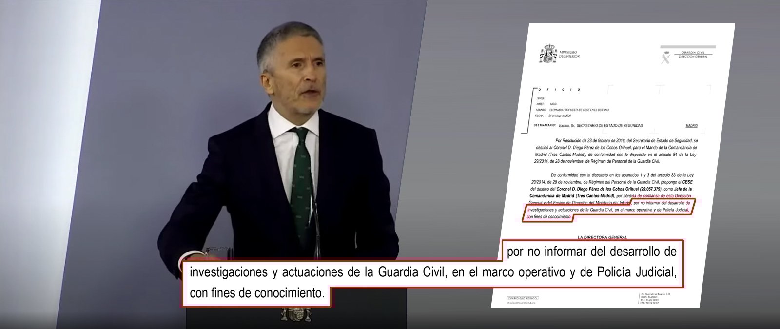 Dos días después, además, Grande-Marlaska aseguraba en la Comisión de Interior del Senado, que ni él, "ni nadie del Ministerio, ni la Dirección General de la Guardia Civil" habían solicitado el informe o conocer su contenido a Pérez de los Cobos.