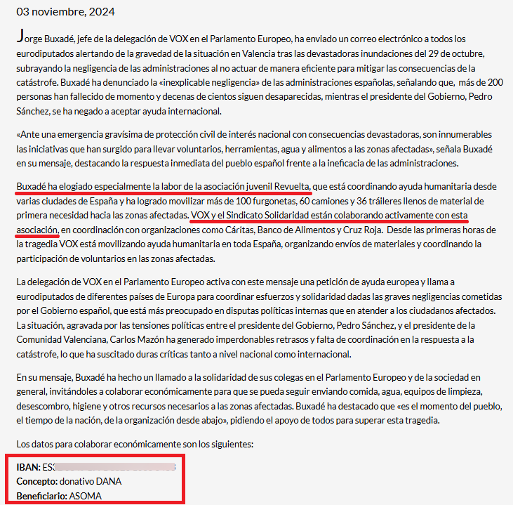 El 3 de noviembre de 2024, Vox publicó un comunicado en su web en el que explicaba que el partido estaba “colaborando activamente” con Revuelta. Añadía que Buxadé envió un email a otros eurodiputados en los que pedía colaboraciones económicas para los afectados de la DANA y “elogiaba especialmente la labor de la asociación juvenil Revuelta” en su “coordinación” de ayuda humanitaria para las zonas afectadas.