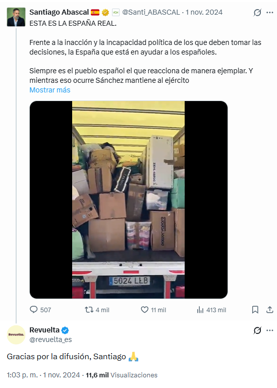 Dos días antes del comunicado, Santiago Abascal ya se había referido a Revuelta. En un tuit en el que incluía un vídeo de la organización juvenil descargando cajas con material para los afectados de la DANA de Valencia, el líder de Vox mencionó la cuenta de Revuelta y dijo que eran “la España real”: “Frente a la inacción y la incapacidad política de los que deben tomar las decisiones, la España que está en ayudar a los españoles. Siempre es el pueblo español el que reacciona de manera ejemplar”. Revuelta respondió al mensaje de Abascal con un: “Gracias por la difusión, Santiago”.
