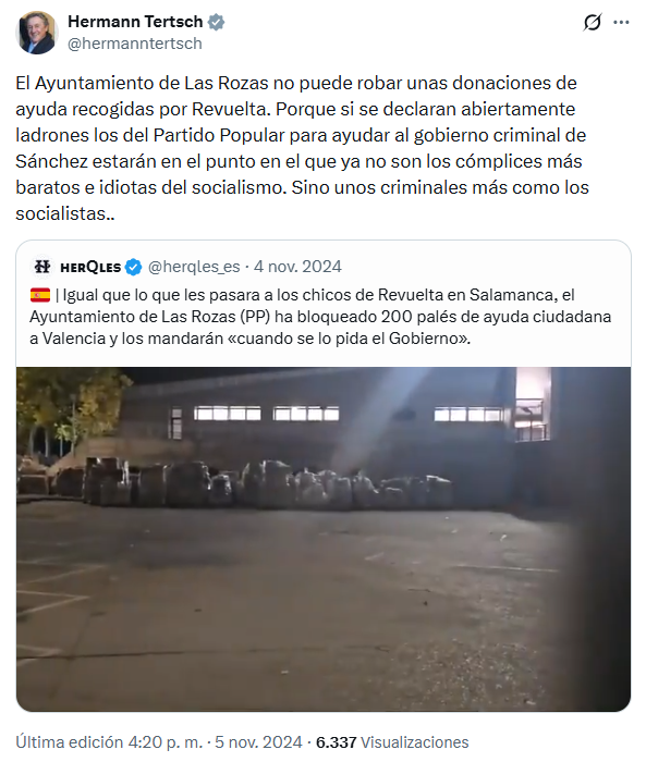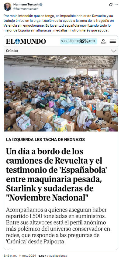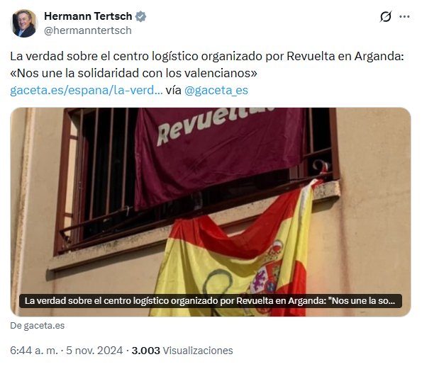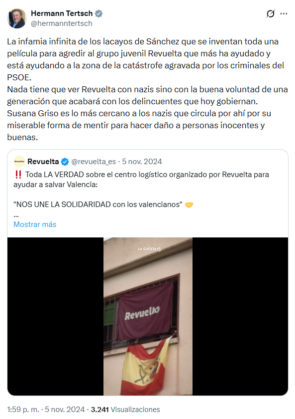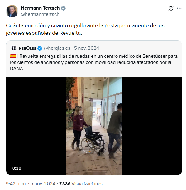 El 11 de noviembre, Hermann Tertsch dijo que era “imposible hablar de Revuelta y su trabajo único en la organización de la ayuda a la zona de la tragedia en Valencia sin emocionarse”. “Es juventud española movilizando todo lo mejor de España sin alharacas, medallas ni otro interés que ayudar”, concluía en Twitter el europarlamentario.
