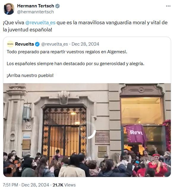 El 28 de diciembre de 2024, Hermann Tertsch tuiteó citando otra publicación de Revuelta en la que anunciaban el reparto de “regalos” en Algemesí: ¡Que viva Revuelta que es la maravillosa vanguardia moral y vital de la juventud española!”