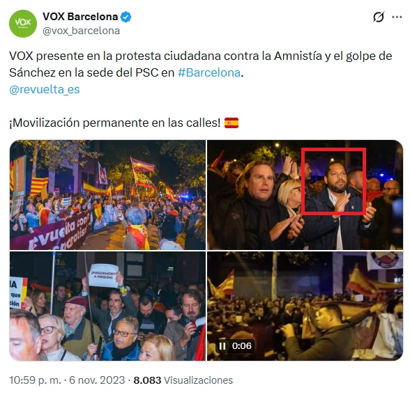 Ignacio Garriga, que ahora ha negado cualquier vínculo del partido con Revuelta, participó en una protesta por la amnistía, organizada por Revuelta. Vox Barcelona publicó varias fotos y en una de ellas salía el número dos del partido.