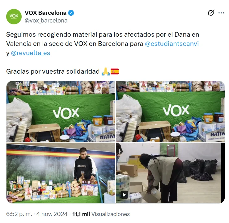 El 4 de noviembre de 2024, la cuenta de Twitter de Vox Barcelona publicó que estaba “recogiendo material por los afectados” por la DANA en Valencia en su sede y que esas donaciones se las entregarían a dos asociaciones, una de ellas era Revuelta.