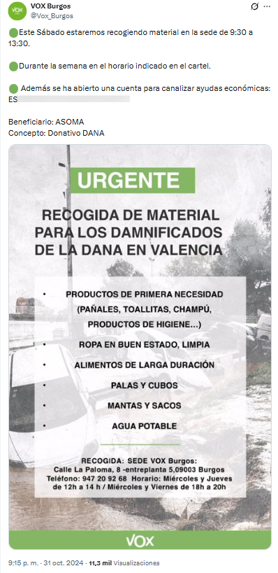 El 31 de octubre de 2024, la cuenta de Twitter de Vox Burgos publicó un tuit en el que pedía donaciones por la DANA a un número de cuenta de ASOMA, y dijeron que recogerían también material en su sede.