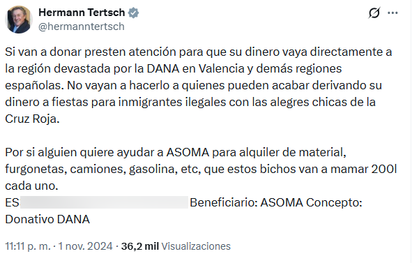 Vox Burgos y Hermann Tertsch promocionaron el número de cuenta de ASOMA para las donaciones de la DANA