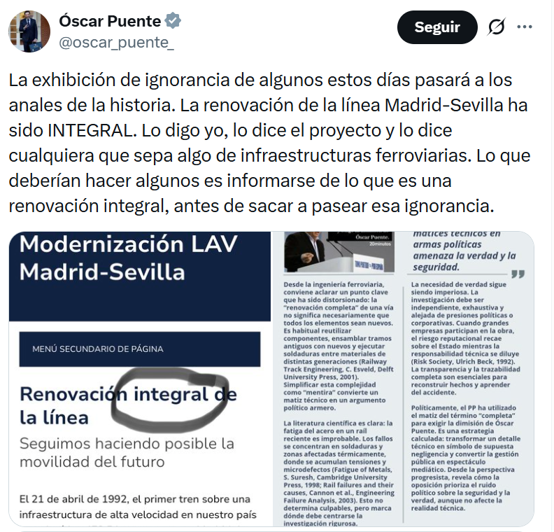 En la Cadena Cope, Puente dijo también el 22 de enero que el accidente es “un suceso muy extraño porque esa vía está recién renovada”. “Ha pasado a auscultación dinámica, geométrica, visual… El propio cambio después pasó otra revisión en enero. Si es algo en la infraestructura tiene que ser algo realmente crítico que no ha dado la cara hasta el momento del accidente”, añadió en el programa ‘Herrera en Cope’ [min. 1:45].