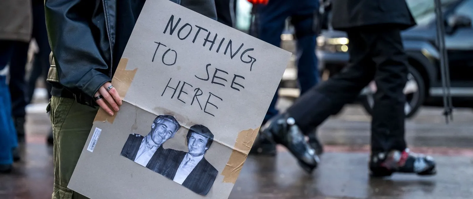 FOTO DE PORTADA: Manifestante con una pancarta de Jeffrey Epstein (I) y Donald Trump (D) en una manifestación en los márgenes del Foro de Davos el 18 de enero de 2026 (Foto por Fabrice Coffrini / AFP).