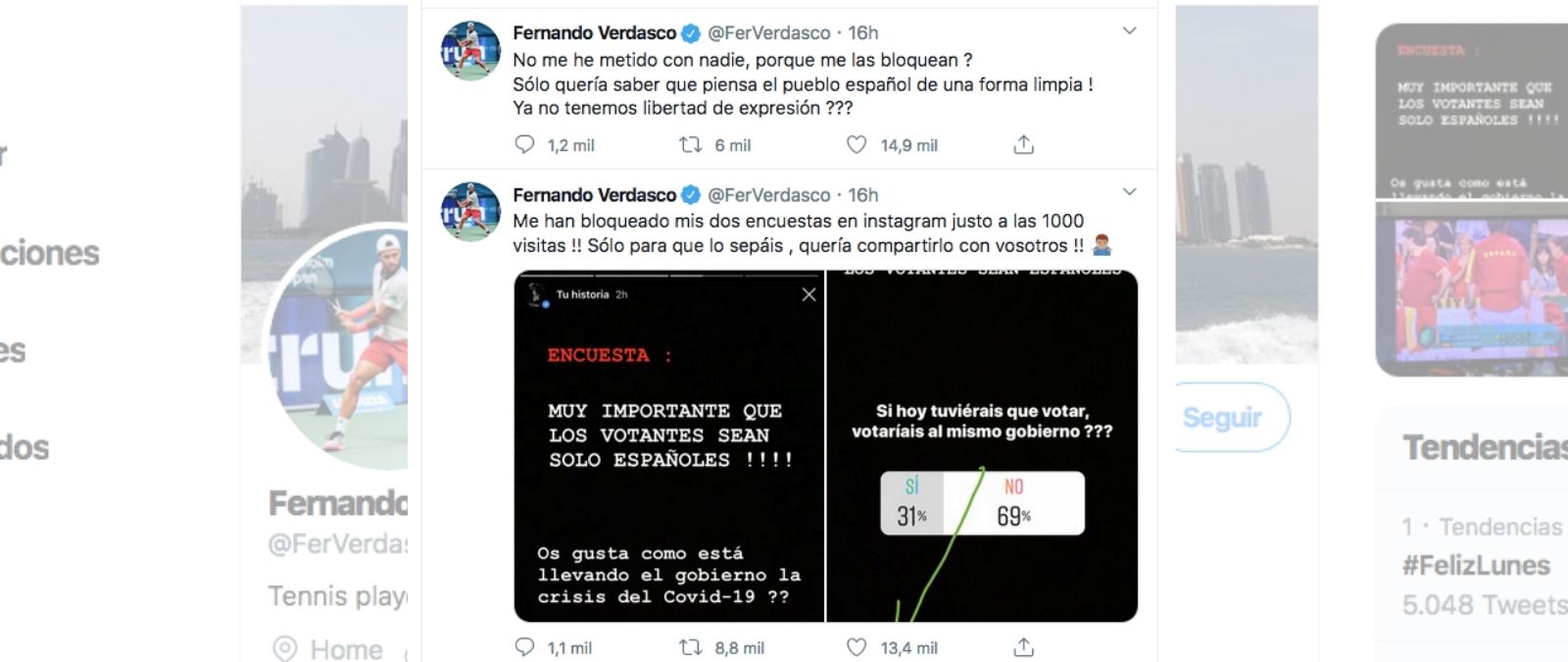 El tenista Fernando Verdasco ha denunciado en su cuenta de Twitter que Instagram ha "bloqueado" una encuesta realizada en la plataforma al limitarle el número de respuestas a 1.000 personas. La pregunta que formulaba es la siguiente: "¿Os gusta cómo está llevando el Gobierno la crisis del COVID-19?" y antes alertaba de que "solo españoles" respondieran al sondeo. En el tuit de denuncia atribuye este hecho a que ya no haya "libertad de expresión" y mensajes en la misma red social acusan al Gobierno de "censurar" la encuesta. Os explicamos lo que ha pasado.