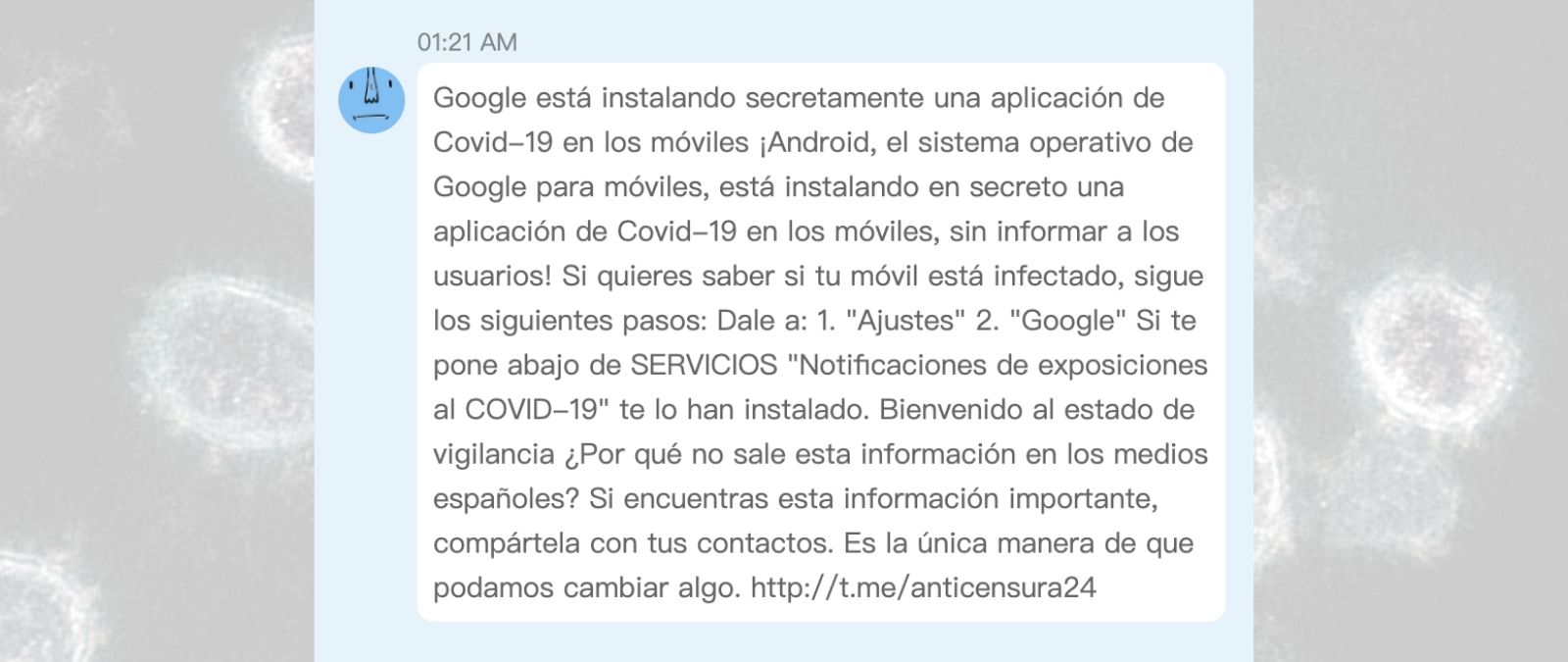 Nos habéis consultado por un mensaje que asegura que Google está instalando "secretamente" una aplicación de COVID-19 en nuestros móviles, sin informar a los usuarios. También dice que hay que seguir una serie de pasos por la configuración del móvil para ver si este está "infectado" y que con esta instalación se entra en el "estado de vigilancia". Os explicamos a qué se debe, pero no se trata de una aplicación de rastreo de coronavirus, sino de un sistema de notificaciones (un arreglo técnico para que una aplicación así funcione).