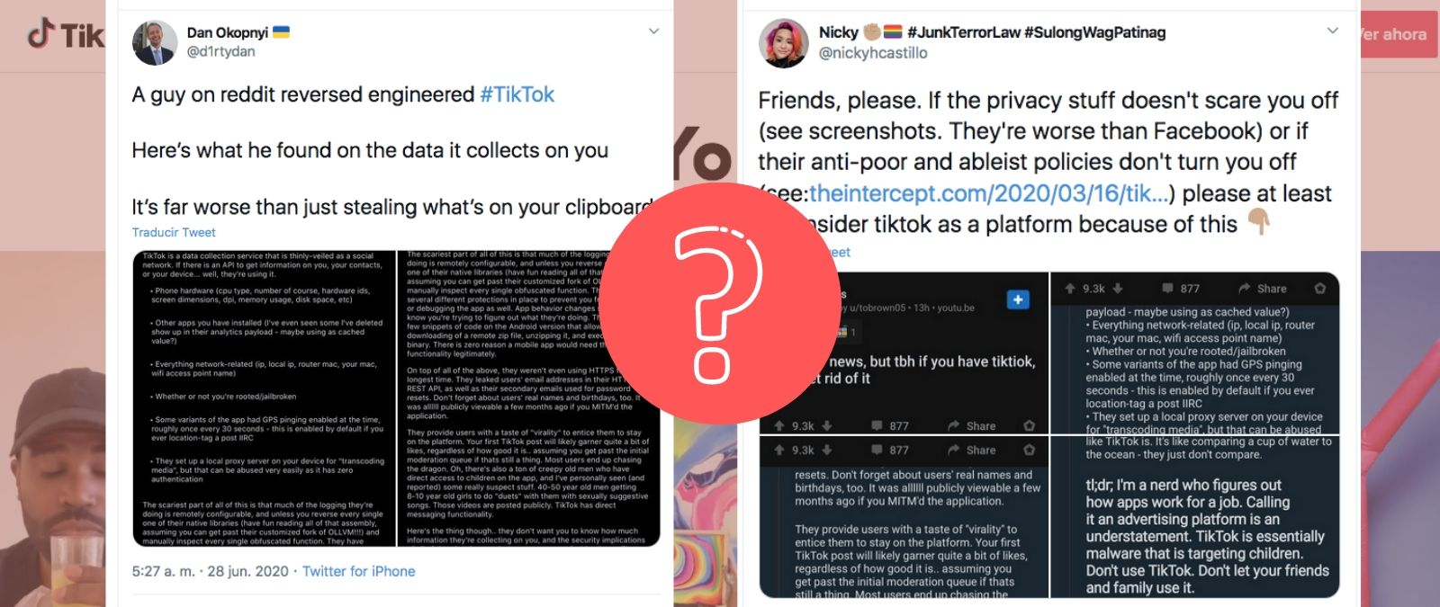 El usuario en cuestión dice ser un ingeniero que ha realizado un proceso de ingeniería inversa a la aplicación para móviles de origen chino TikTok y asegura que recoge una serie de datos de nuestros teléfonos. Entre ellos: todos los datos de tu dispositivo, como la marca, la memoria que se usa o los números de identificación del móvil; el resto de aplicaciones que tenemos instaladas; todos los accesos a la red que usas o actualizaciones de nuestra ubicación GPS. El post original es de hace tres meses y el 2 de julio lo actualizó para explicar que iba a analizar las actualizaciones de la app.