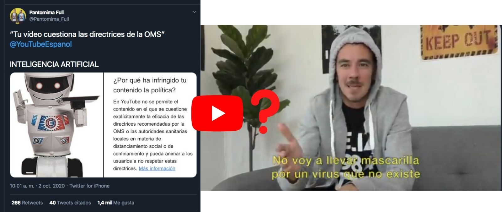YouTube evitó durante un día que un vídeo paródico en el que se critica la actitud de los negacionistas apareciese en la plataforma. El conocido dúo Pantomima Full presentó un vídeo en el que imita los argumentos sin evidencias contra el uso de las mascarillas, pero este no duró mucho subido a la plataforma, que lo retiró porque consideró que su contenido cuestionaba "explícitamente la eficacia de las directrices recomendadas por la OMS". Mientras, otros vídeos desinformadores siguen circulando sin que la plataforma los detecte. La compañía reaccionó por la noche volviendo a colgar el vídeo y atribuyendo el error a sus algoritmos.*