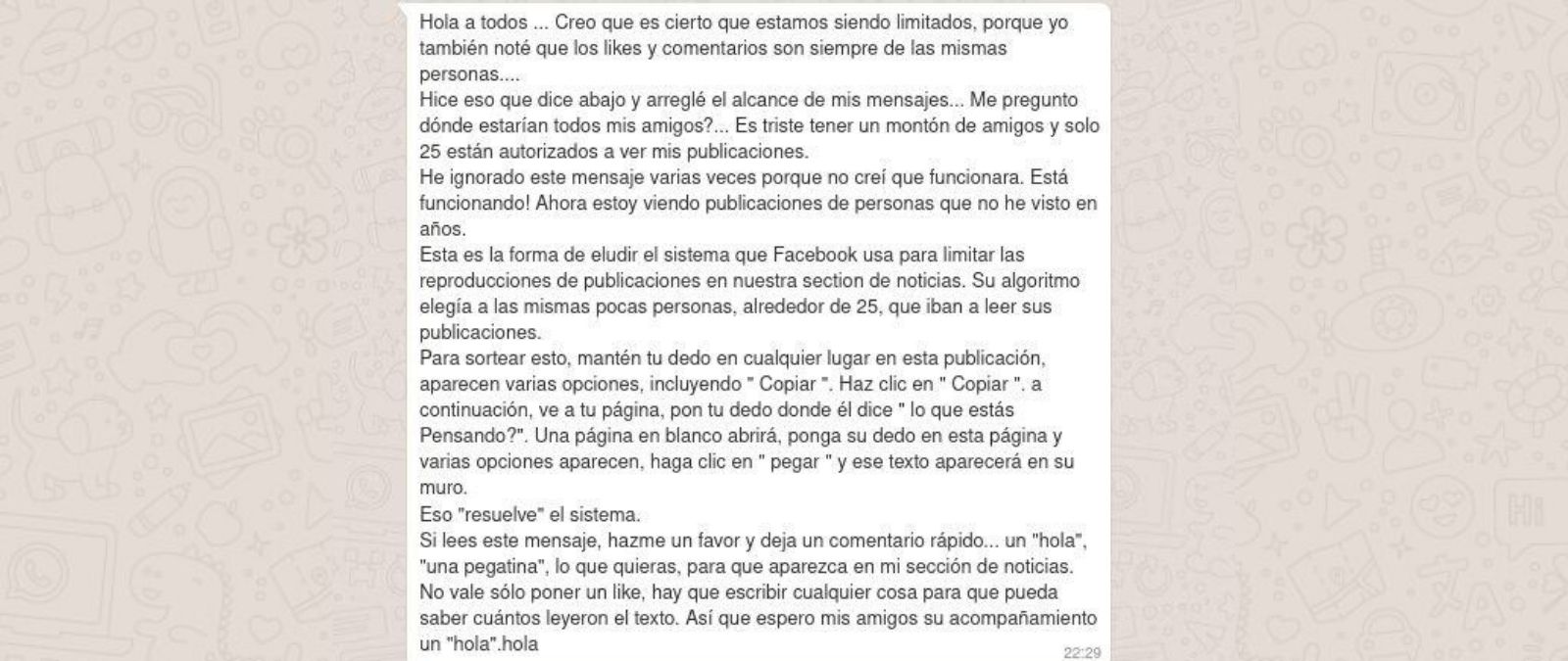 La cadena también dice que para "resolver" el problema "no vale sólo poner un like, hay que escribir cualquier cosa para que pueda saber cuántos leyeron el texto". Esto tampoco se ajusta al funcionamiento de los algoritmos de recomendación de las plataformas, ya que la mera interacción con publicaciones también hace que estas se muestren más frecuentemente.
