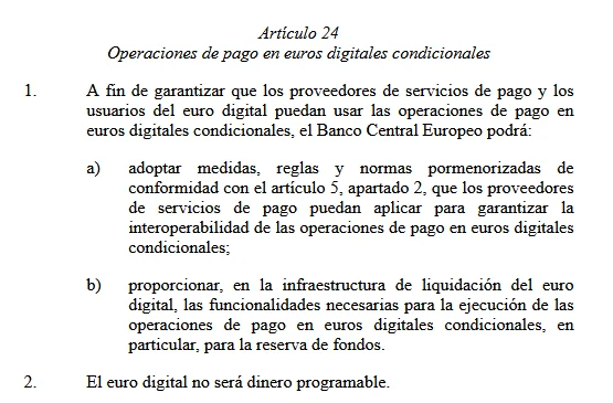 La propuesta legislativa actual de la Comisión prohíbe expresamente que los euros sean programables. Los ciudadanos sí que podrán configurar pagos automáticos, que se denominan pagos condicionados en la legislación europea, como una transferencia recurrente a amigos y familiares. Pero es importante recordar que este texto sigue siendo una propuesta y puede sufrir modificaciones a lo largo del proceso legislativo hasta ser aprobada.