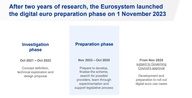 El 30 de octubre el Consejo de Gobierno del BCE anunció el fin de la etapa de preparación (que comenzó en noviembre de 2023) y el comienzo de la fase técnica. La institución financiera asegura que se han logrado cumplir los objetivos de la etapa de preparativos, entre los que estaba redactar un borrador del reglamento del sistema, seleccionar posibles proveedores, experimentar e investigar a los usuarios, análisis técnicos, y la interacción con “las partes interesadas”. En esta nueva etapa, está previsto que se realice la preparación técnica, se colabore con proveedores para pruebas pilotos, y se dé apoyo a la fase legislativa.