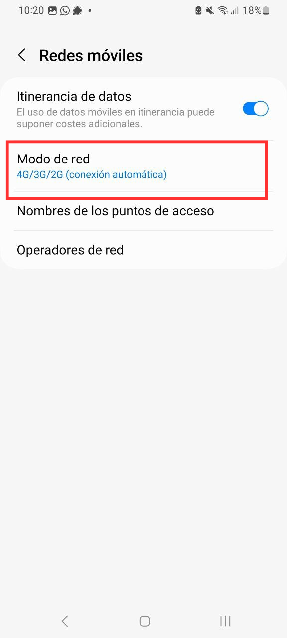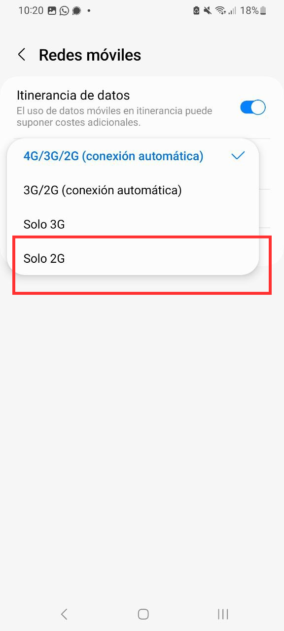 Presionamos ‘Modo de red’ y seleccionamos en el menú desplegable ‘Solo 2G’.
