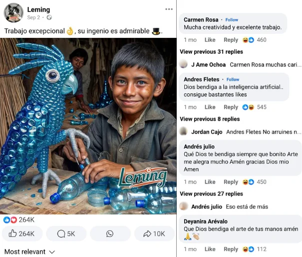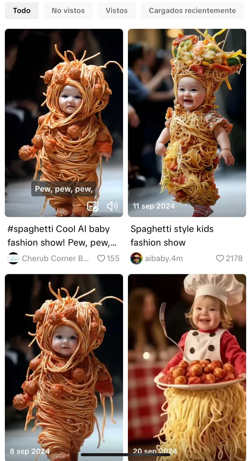 Tampoco es complejo identificarlo, según Almudena Barreiro, experta en inteligencia artificial y maldita que nos ha prestado sus superpoderes. La especialista indica que podemos reconocer estos contenidos ya que suelen ser repetitivos, genéricos, incoherentes, con una “estética rara que no cuadra del todo”, y pueden resultar inentendibles para los usuarios. Cantón agrega que se presentan en distintos formatos, como “imágenes llamativas pero absurdas, vídeos surrealistas o incluso artículos llenos de texto que pueden parecer ‘normales’, pero que con una lectura un poco más atenta se detecta que están vacíos de contenido realmente útil”. Los vídeos de animales en situaciones heróicas o conmovedoras o los de bebés en situaciones grotescas pueden ser ejemplos de este contenido.