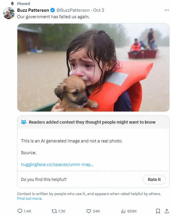 “Más allá del objetivo de ganar dinero, creo que también puede haber detrás una estrategia de sembrar caos e incredulidad para que ya no creas ninguna imagen, tampoco las reales”, afirma el investigador. De esta manera, según Cantón, “se podría aumentar el poder de ‘narrativas alternativas’”. El experto ejemplifica con la imagen viral de una niña abrazando a un cachorro en un bote durante el huracán Helene en Estados Unidos: “Aunque los usuarios sabían que era falsa, decidieron compartirla porque la interpretan como representativa de la realidad, por su poder simbólico, y se hizo viral para criticar la respuesta política”.