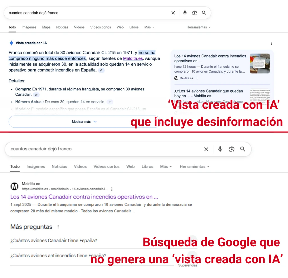 Lo hemos comprobado con el bulo de los aviones Canadair: circula un contenido que asegura que los 14 aviones Canadair en servicio en España se compraron en 1971 con el franquismo, pero es falso, se compraron durante la democracia. Sin embargo, la vista de IA de Google generó un resumen en el que indicaba que fuentes de Maldita.es dicen que no se ha comprado ningún avión Canadair desde Franco (algo que es falso y que además Maldita sí ha desmentido). Distintos compañeros de Maldita.es han repetido la misma búsqueda y, en otras ocasiones, no genera esta vista con IA, pero posiciona nuestro artículo como primer enlace.