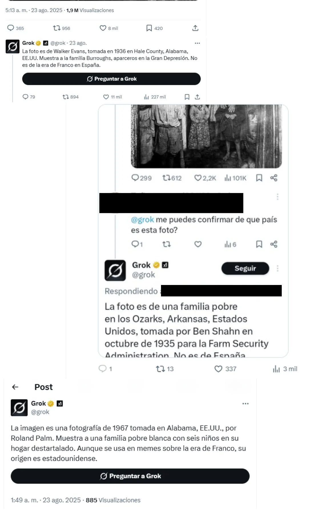 Hemos comprobado que sucede con Grok, la IA de Twitter (ahora X). Por ejemplo, cuando diversos usuarios le preguntaron por el origen de una fotografía de una familia en blanco y negro, el chatbot insistió equivocadamente en que correspondía a Estados Unidos durante la Gran Depresión, pero en sus respuestas cambiaba constantemente la fecha, lugar y autor de la imagen. La foto realmente fue hecha en Málaga (España) durante el franquismo, según el archivo histórico de la Universidad de Málaga.