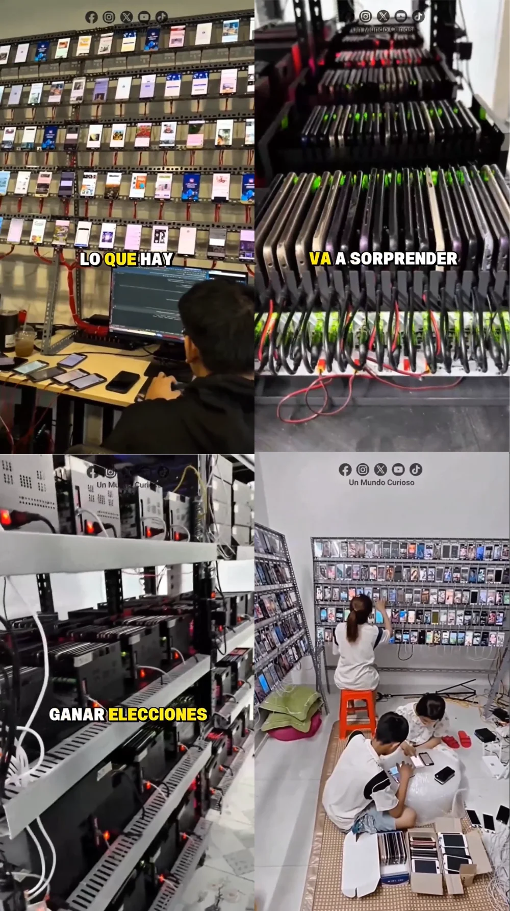 Efraín García, tecnólogo, informático y maldito que nos ha prestado sus superpoderes, sostiene que “existen casos que demuestran que las granjas de móviles son herramientas reales utilizadas por actores estatales y/o privados para manipular la opinión pública y difundir desinformación a gran escala”. De hecho, investigadores de la Universidad de Toronto y de la Universidad de Massachusetts Amherst identificaron en un estudio de 2024 a las personas que operan estas granjas de teléfonos como “trabajadores dentro de la industria de la desinformación”.
