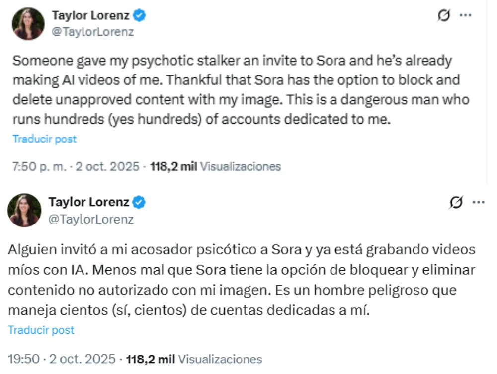 Jorge Louzao, experto en ciberseguridad y maldito que nos ha prestado sus superpoderes, dice que uno de los principales riesgos es la suplantación de identidad, ya que los deepfakes de los usuarios “se pueden difundir sin control, usarse para acosarlos, extorsionarlos o simplemente avergonzarlos, o incluso para amplificar discursos de odio, falsedades y discursos extremos”. Por ejemplo, la periodista Taylor Lorenz denunció que su acosador usó la herramienta de OpenAI para crear vídeos con IA de ella.