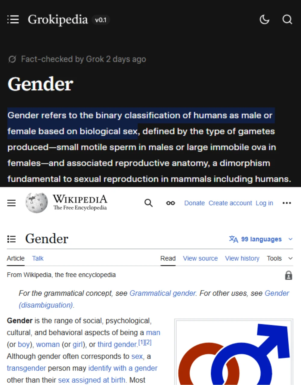 Otro ejemplo es el artículo que define el término “género”. En Wikipedia, por ejemplo, se describe como un “rango de aspectos sociales, psicológicos, culturales y conductuales de ser hombre, mujer o tercer género”. Mientras que Grokipedia lo define como “una clasificación binaria de los humanos como hombres o mujeres basada en el sexo biológico”. Musk ha sido crítico en reiteradas ocasiones de lo que él considera “ideología de género”.