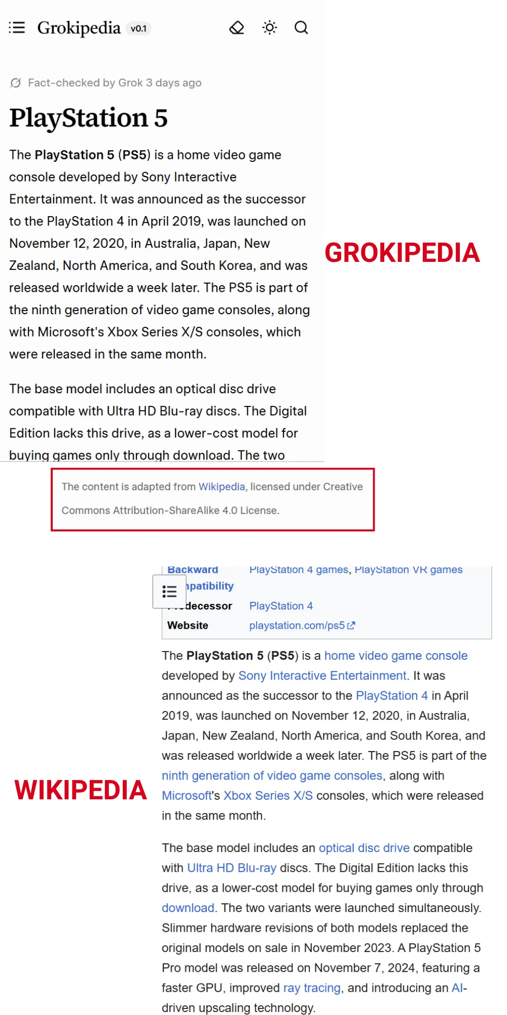 En otros artículos, Grokipedia sí da créditos a su competencia. Es el caso de la entrada sobre la Playstation 5 cuyo contenido es casi idéntico al de Wikipedia. "El contenido está adaptado de Wikipedia y se distribuye bajo la licencia Creative Commons Atribución-CompartirIgual 4.0”, dice el cierre del artículo.