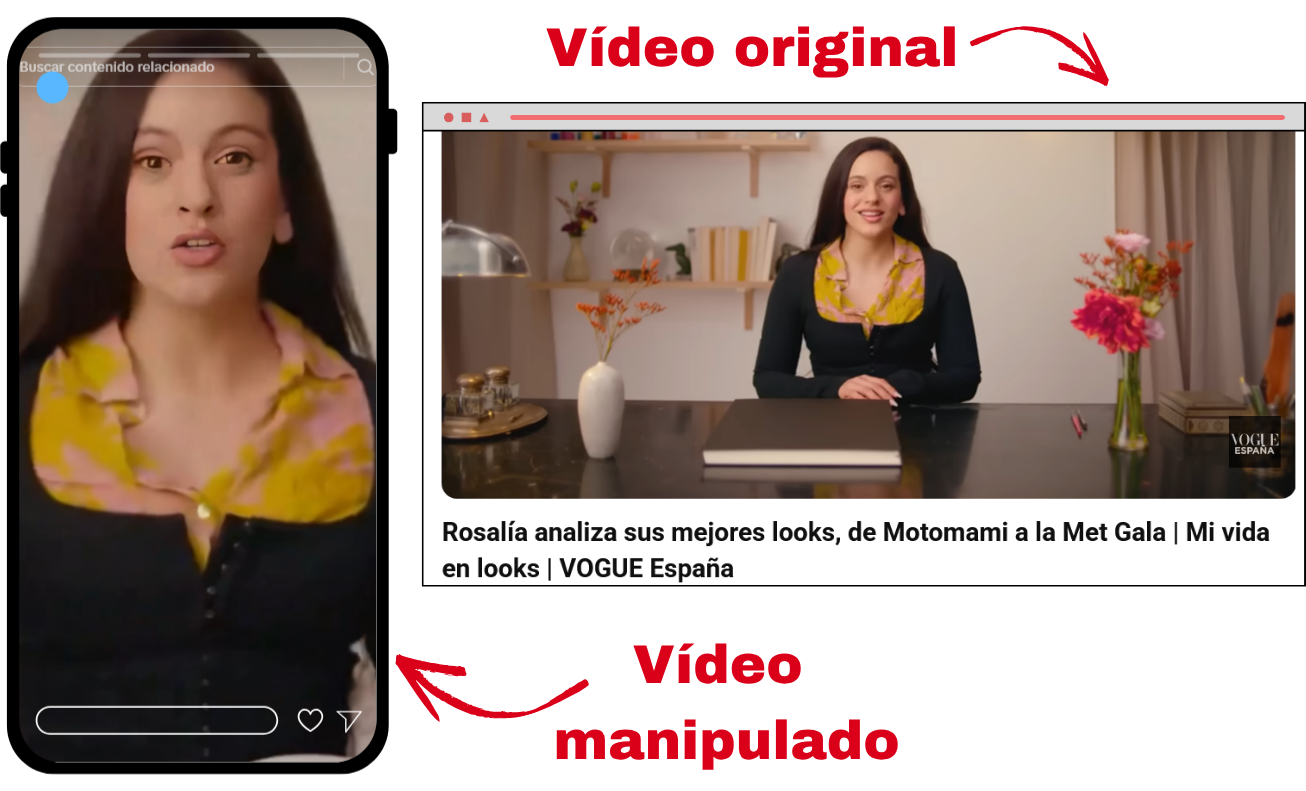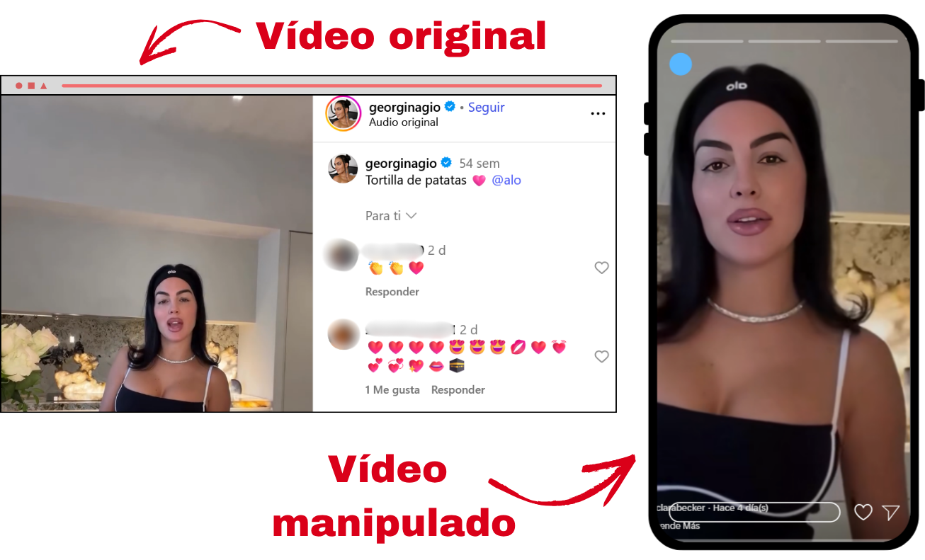 El vídeo de Rosalía ha sido alterado para modificar el movimiento de sus labios y crear declaraciones falsas. En realidad, procede de una publicación de Vogue Spain de 2023 en la que la artista analizaba sus looks de los últimos años. En el vídeo original, Rosalía no hace ninguna de las declaraciones que aparecen en su versión manipulada. En su caso, el vídeo real de Georgina lo publicó la influencer en su cuenta de Instagram el 13 de octubre de 2024 y en él se graba cocinando una tortilla de patatas.