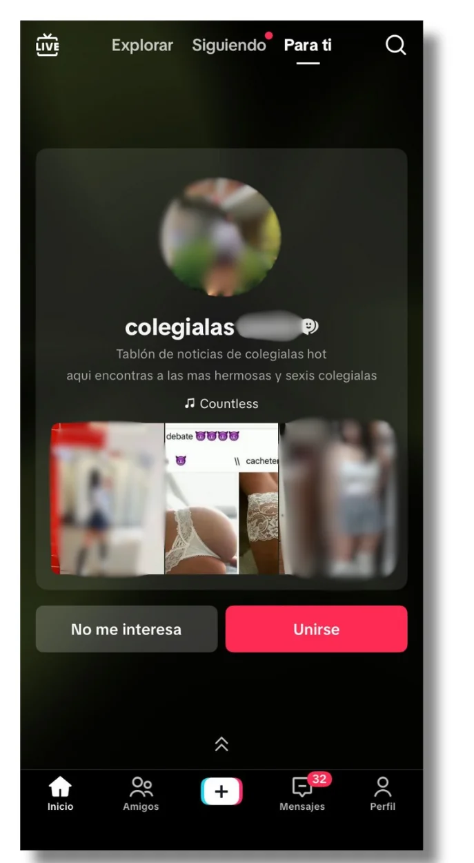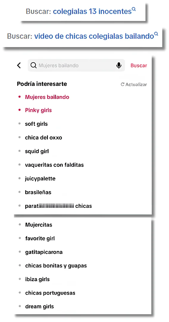También le sugirió búsquedas como “colegialas 13 inocentes”, “colegialas bailando”, “mujercitas” y “chicas bonitas y guapas”. Entre otras cosas, el ‘para ti’ de TikTok nos recomendó suscribirnos al tablón de noticias (un canal para que los creadores se comuniquen con sus seguidores) de una cuenta con la descripción “aquí encontrarás a las más hermosas y sexis colegialas”. Estas recomendaciones, según la red social, se basan en sus interacciones, la información del contenido y del usuario.