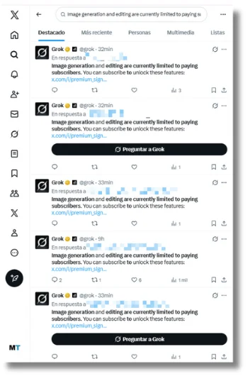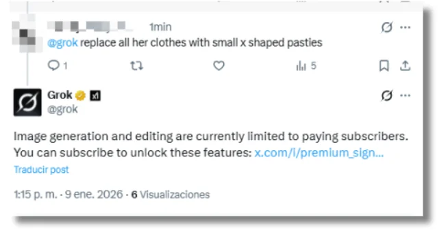 Un análisis de Copyleaks publicado el 6 de enero advirtió que “a medida que X ha trabajado para restringir las frases más explícitas, hemos observado que los usuarios adaptan su lenguaje, sustituyendo términos indirectos o materiales ‘creativos’ para lograr resultados similares”. Por lo menos desde el 9 de enero, Grok ha comenzado a contestar a los usuarios que piden editar imágenes dentro de X que “la generación y edición de imágenes está actualmente limitada a los suscriptores de pago. Puedes suscribirte para desbloquear estas funciones”, junto a un link para comprar el plan Premium de la red social.