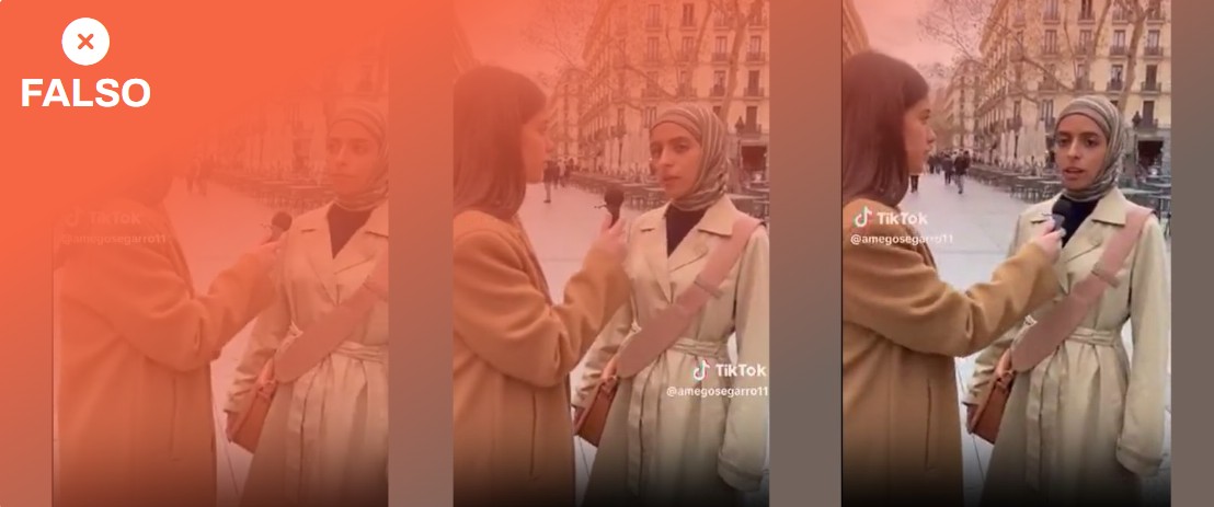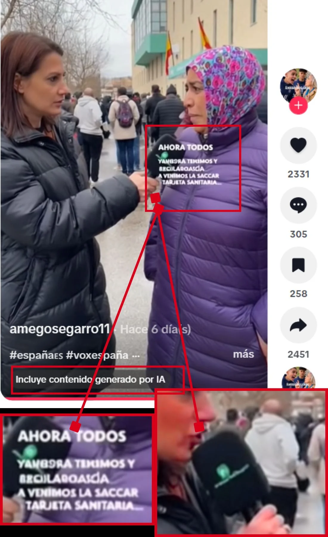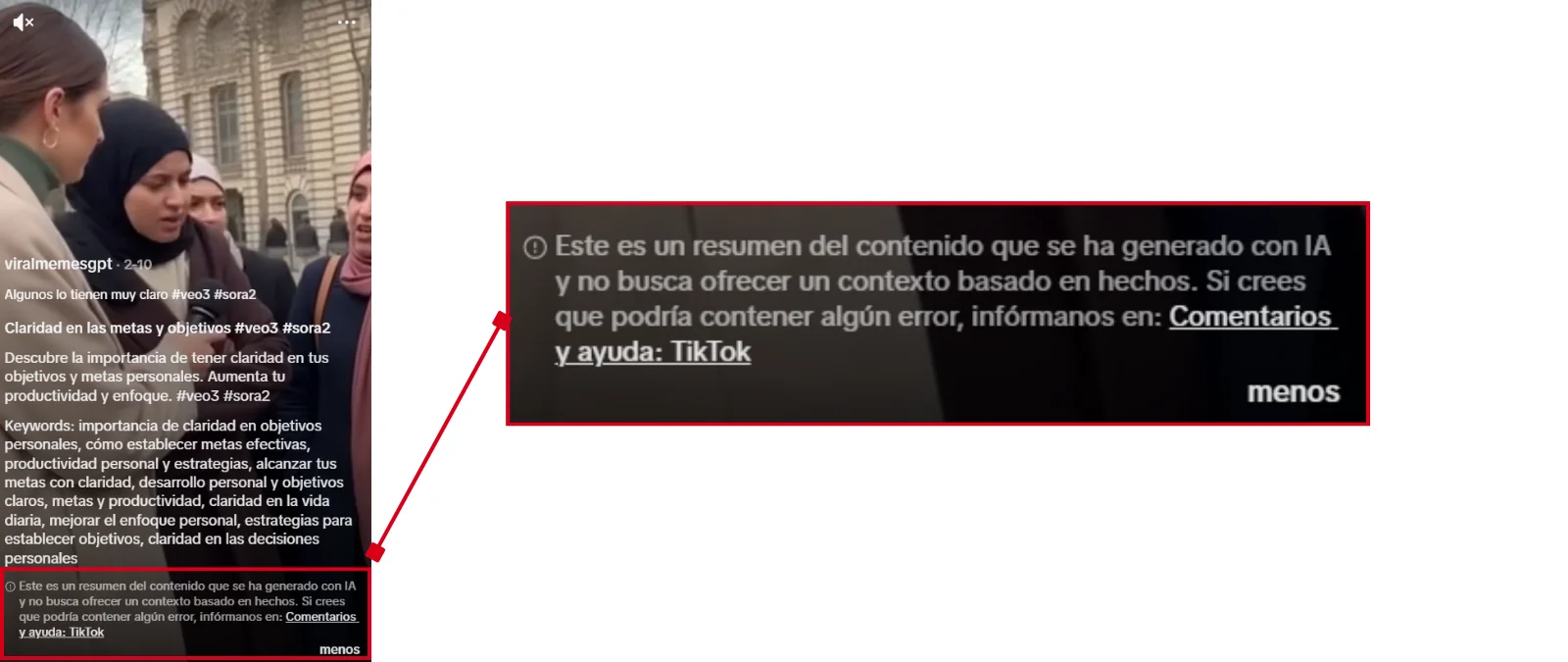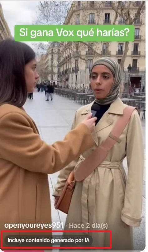 El vídeo que muestra a una mujer inmigrante y musulmana diciendo que si gana Vox las elecciones se vuelve a su país porque no trabaja y se acabarán “las ayudas” no es real. Fue creado con inteligencia artificial. Como se puede ver en la marca de agua del vídeo que circula, la publicación original es de la cuenta de TikTok @openyoureyes951, que en el propio vídeo tiene la etiqueta de “incluye contenido generado por IA”.