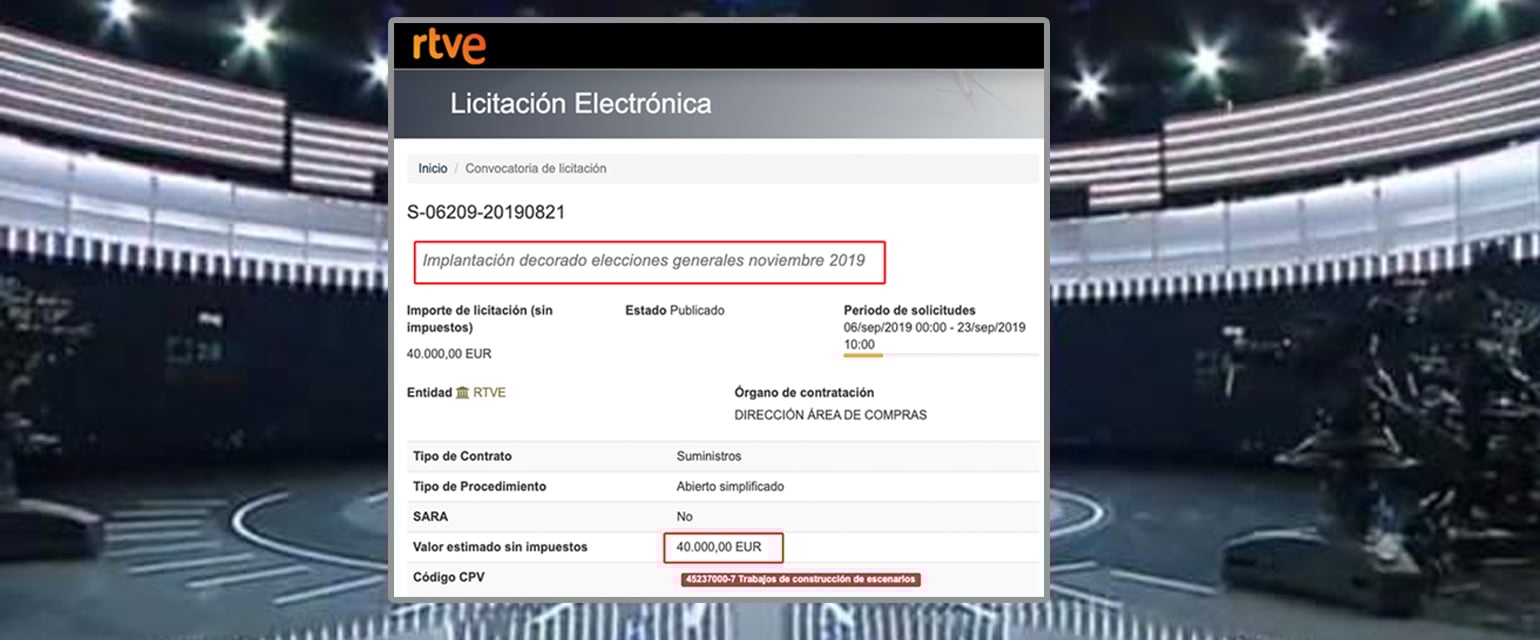 Nos habéis preguntado en redes sociales y en nuestro número de Whatsapp (655 198 538) por una licitación de RTVE para contratar un decorado para unas posibles elecciones generales en noviembre de 2019 por 40.000 euros. Este documento es real, pero no obliga a la televisión pública a pagar este dinero si no hay elecciones, ni quiere decir que vaya a haberlas. Os lo explicamos.