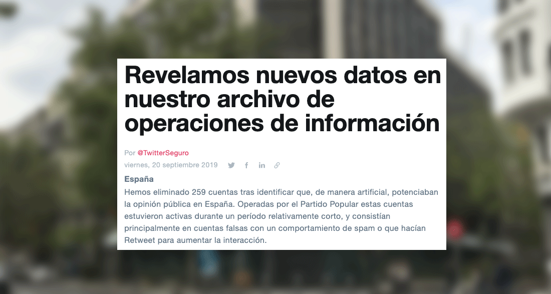 La red social Twitter ha anunciado este 20 de septiembre en un comunicado que ha eliminado 259 cuentas falsas "operadas por el Partido Popular", a través de las cuales "potenciaban la opinión pública en España". Tras acceder a la base de datos de la plataforma, Maldita.es ha podido comprobar que estos perfiles publicaron más de 56.000 tuits para apoyar al presidente del PP, Pablo Casado, y criticar a sus contrincantes políticos con distintos hashtags que también fueron utilizados por la cuenta oficial de la formación.