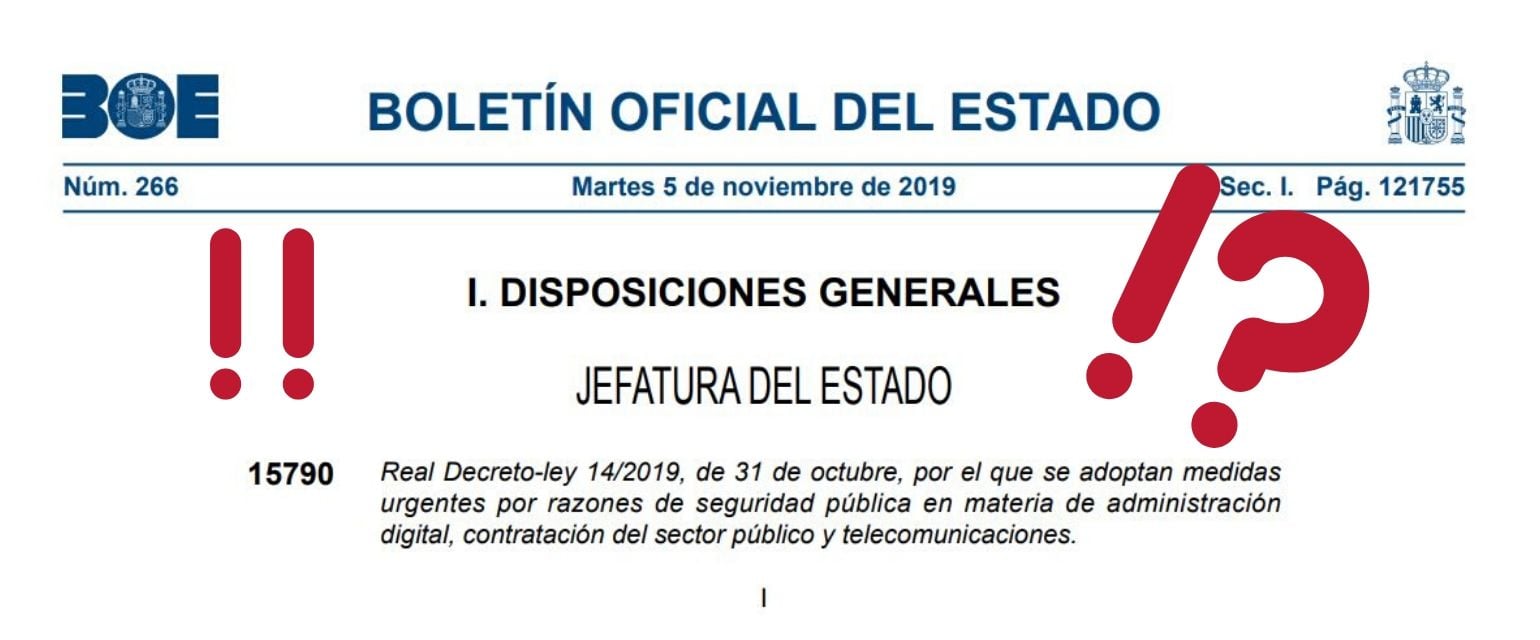 Este martes se ha publicado en el Boletín Oficial del Estado (BOE) el decreto ley 14/2019 por el que se adoptan medidas urgentes por razones de seguridad pública en materia de administración digital, contratación del sector público y telecomunicaciones. A la vista de la repercusión que ha tenido el amplio margen de maniobra que concede al Gobierno, lo desgranamos en este artículo para estar atentos a todas las implicaciones.*