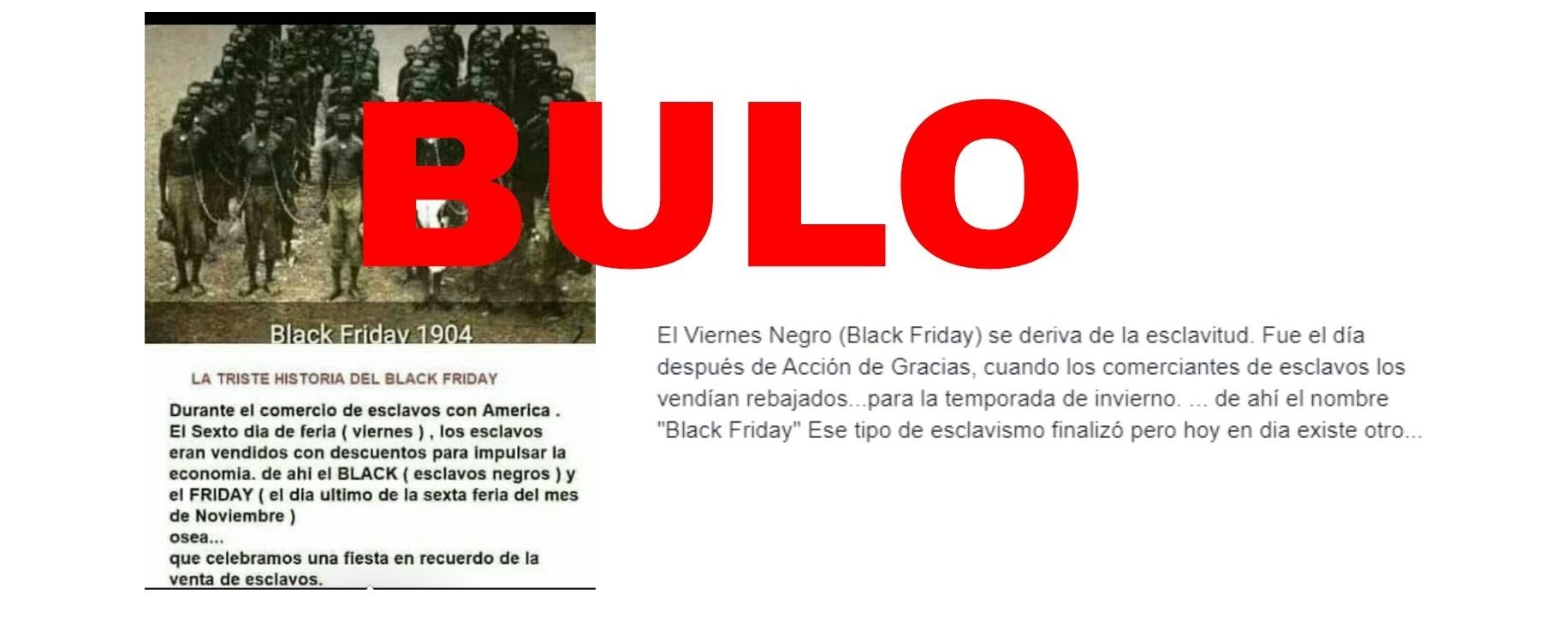 No se llama "Black Friday" por los esclavos negros. Cada mes de noviembre con motivo del "Black Friday" (Viernes negro en inglés) vuelve a circular el bulo de que tiene un origen esclavista. Se dice que el día después de Acción de Gracias los comerciantes de esclavos los vendían rebajados para la temporada de invierno y de ahí vendría el nombre de 'Black Friday'. Es un bulo.