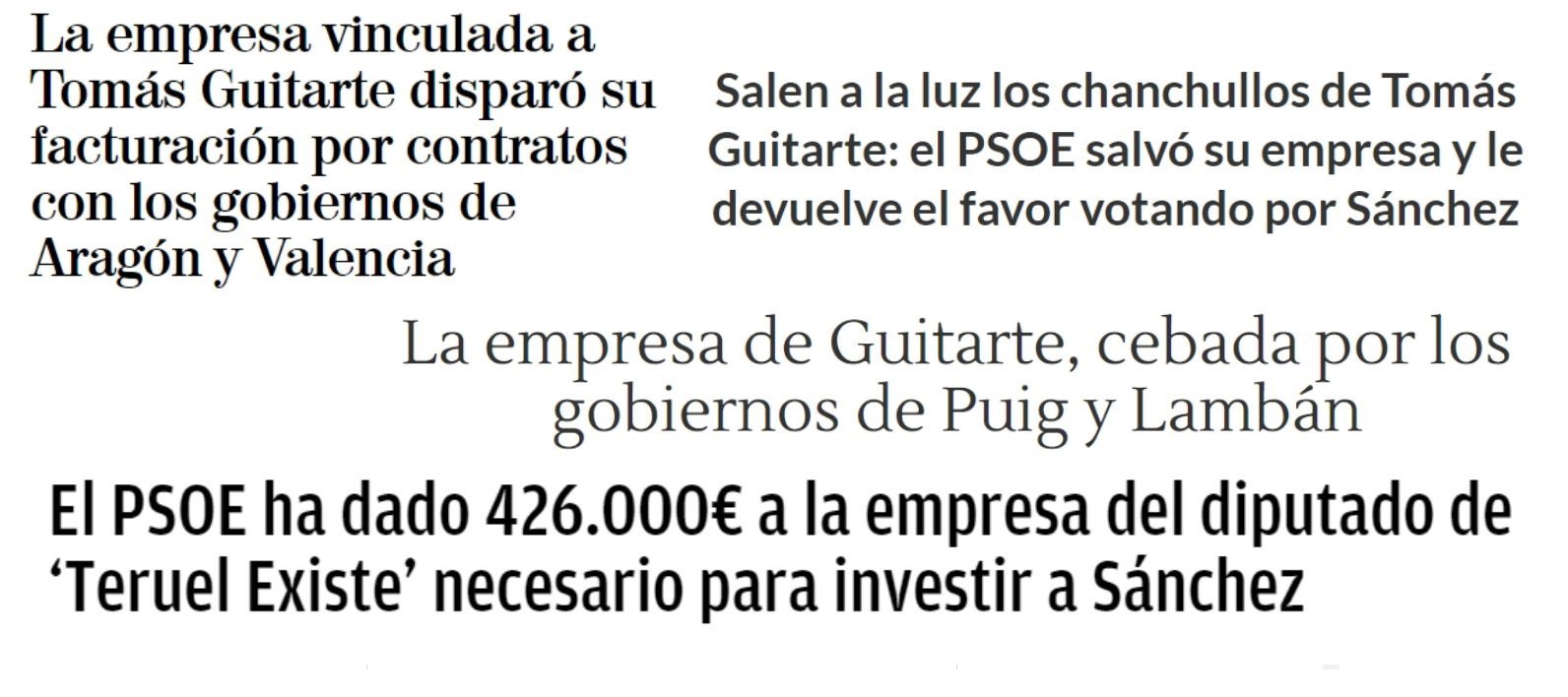 El 6 de enero El Mundo publicaba que 'La empresa de Tomás Guitarte dispara su facturación por contratos con los gobiernos de Aragón y Valencia'. Horas después, cambiaba el titular a 'La empresa vinculada a Tomás Guitarte disparó su facturación por contratos con los gobiernos de Aragón y Valencia'. Es decir, la empresa ha pasado de ser de Tomás Guitarte a sólo "vinculada" y "dispara" por "disparó".
