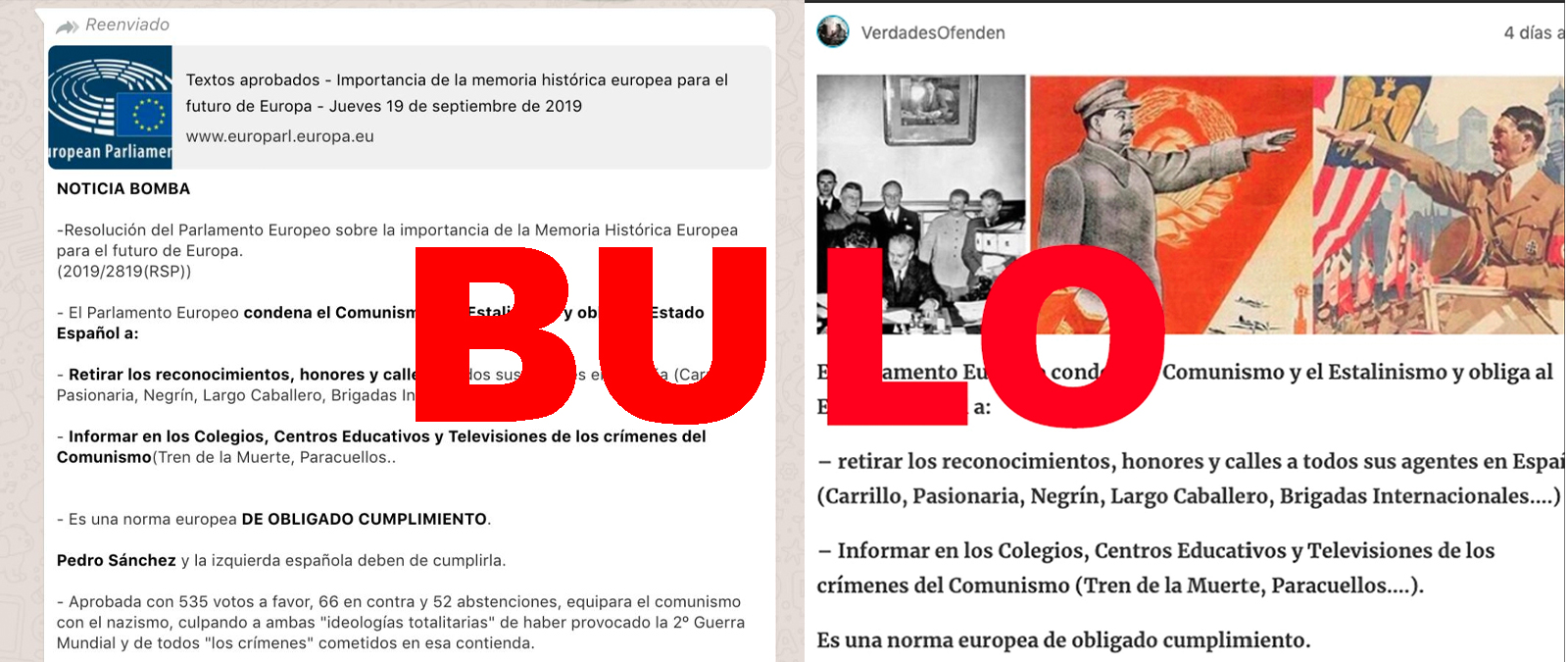 La cadena viralizada y contenidos como el publicado por el blog Verdades Ofenden afirman que "una norma europea de obligado cumplimiento" impone al Gobierno español la retirada de "los reconocimientos, honores y calles" a todos los "agentes en España" del comunismo y estalinismo. Estos contenidos surgen a partir de la aprobación en el Parlamento Europeo el pasado 19 de septiembre de 2019 de un texto que ni es vinculante ni dice lo que se afirma en el contenido viralizado.