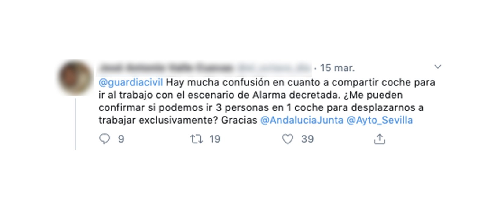 Sin embargo, antes de la publicación del tuit anterior habían asegurado en hasta tres ocasiones que acudir al trabajo en un mismo vehículo con otros compañeros no incumplía lo establecido en el decreto.