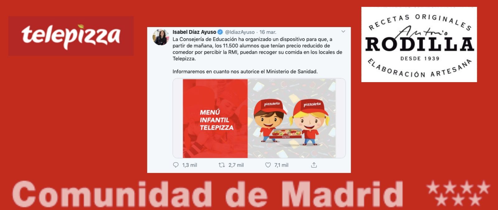 Con el estado de alarma por el coronavirus, este 16 de marzo diferentes dirigentes del Gobierno de la Comunidad de Madrid, como la presidenta Isabel Díaz Ayuso o el consejero de Educación Enrique Osorio anunciaron un acuerdo con las marcas de restauración Telepizza y Rodilla para distribuir menús escolares. Nos habéis preguntado por ella y os contamos qué sabemos.