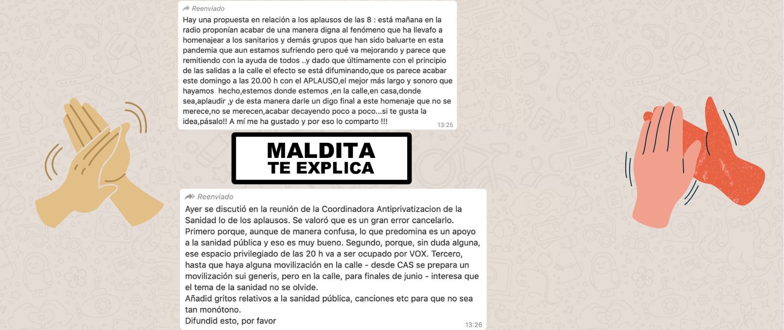 La Coordinadora Anti-Privatización de la Salud Pública (CAS) también se opone a este fin de los aplausos. CAS ha confirmado a Maldita.es que el 13 de mayo acordaron en una reunión estatal considerar un error cancelar los aplausos porque predomina "un apoyo a la sanidad pública", porque "ese espacio privilegiado de las 20 h va a ser ocupado por Vox y porque "hasta que haya alguna movilización en la calle interesa que el tema de la sanidad no se olvida", como afirma una cadena de WhatsApp que se ha viralizado en contra del fin del aplauso de las 20 horas.
