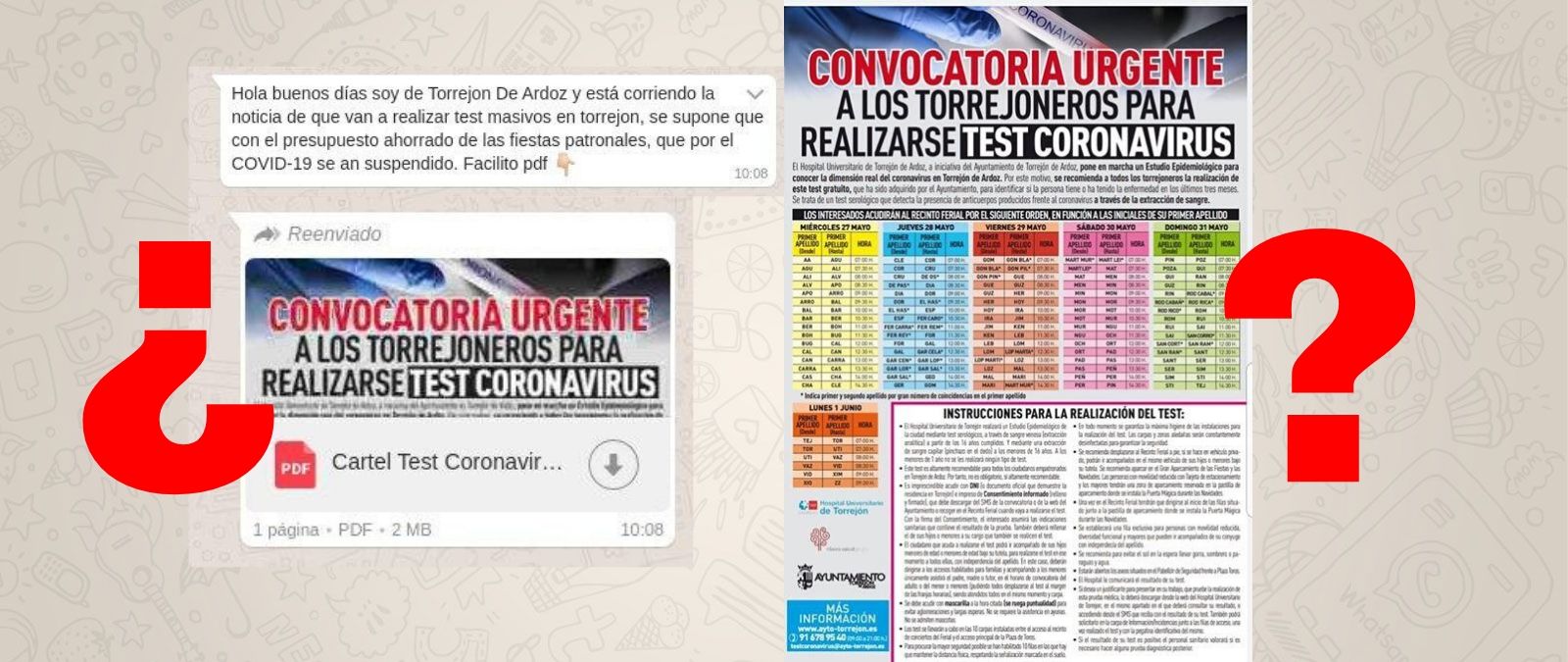 Está circulando mucho un contenido por el que nos habéis preguntado a través de nuestro servicio de WhatsApp y por La Buloteca que asegura que a partir del miércoles 27 de mayo, el Hospital Universitario de Torrejón, a iniciativa del Ayuntamiento de la localidad madrileña, va a realizar test de coronavirus a todas las personas que vivan en el municipio usando el presupuesto de las fiestas patronales que este año no se van a poder celebrar. El Ayuntamiento de Torrejón de Ardoz (Madrid) ha publicado el 26 de mayo un comunicado en el que afirma que las fechas aparecidas en redes sociales "no son oficiales" y que "ningún vecino" debe acudir el 27 de mayo al Recinto Ferial "hasta nueva indicación". Os lo explicamos: