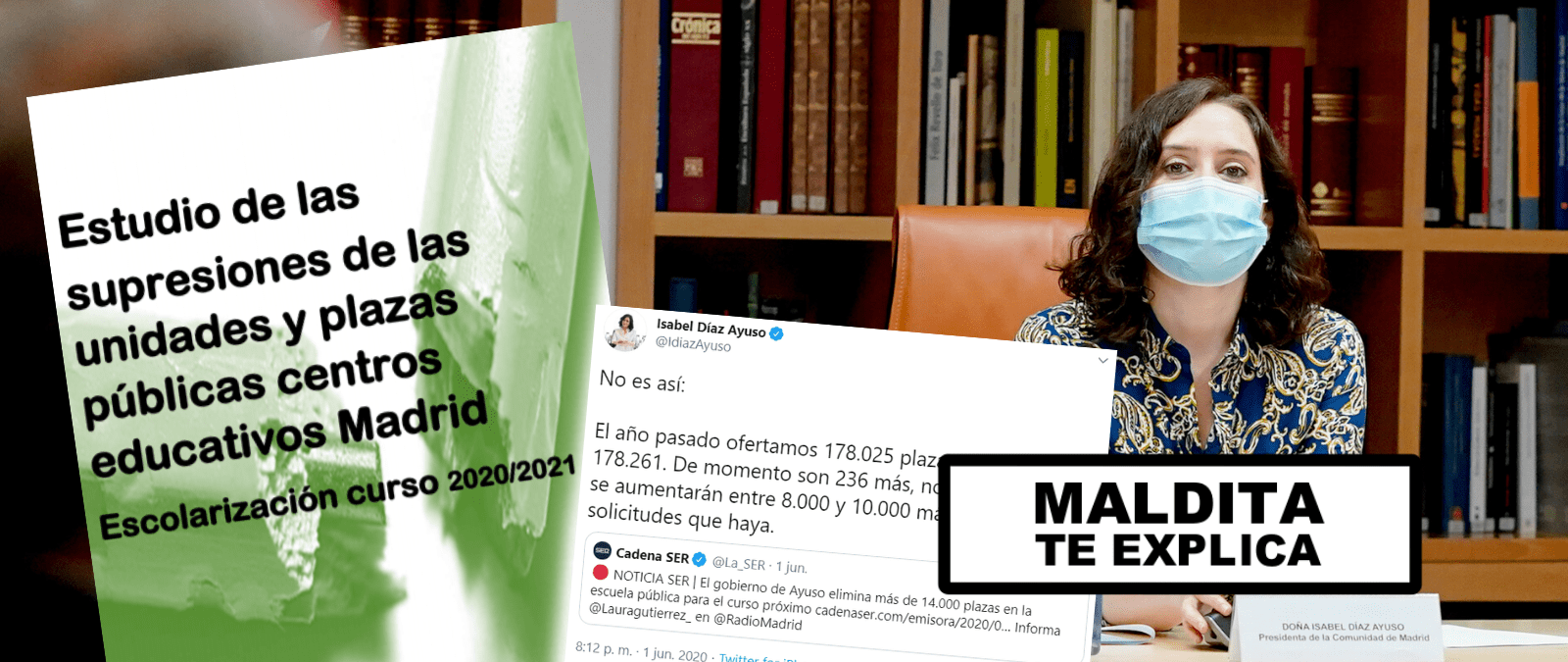 La presidenta de la Comunidad de Madrid, Isabel Díaz Ayuso, ha negado en Twitter que su Gobierno haya eliminado más de 14.000 plazas de algunos centros educativos públicos, tal y como adelantaba la Cadena Ser a partir de un informe realizado por Comisiones Obreras (CCOO). “No es así. El año pasado ofertamos 178.025 plazas y este año 178.261. De momento son 236 más, no 14.000 menos. Y se aumentarán entre 8.000 y 10.000 más según las solicitudes que haya”, ha explicado la presidenta. Sin embargo, los datos del informe de CCOO son sobre la escuela pública exclusivamente y Díaz Ayuso incluye en su respuesta los de la concertada. Os lo explicamos: