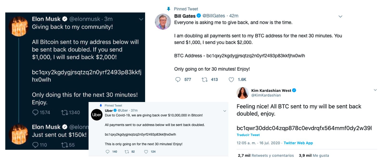 En la noche de este 15 de julio, las cuentas de Twitter de personas conocidas como Elon Musk, Bill Gates o Barack Obama y las de empresas como Uber, todas ellas verificadas, han sido hackeadas y utilizadas para llevar a cabo una estafa relacionada con la criptomoneda bitcoin. En varios tuits publicados a través de sendas cuentas, se aseguraba que todos aquellos que hicieran un pago en bitcoin a una cuenta determinada recibirían el doble de lo invertido.