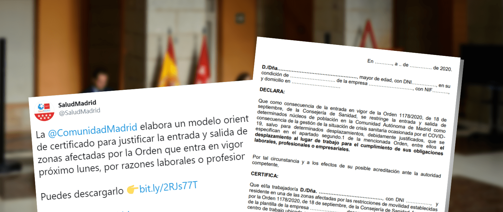 Nos habéis preguntado si es real este justificante que circula por las redes sociales y que certifica la entrada y salida de las zonas afectadas por las restricciones de movilidad establecidas por la Comunidad de Madrid. Es real, la Consejería de Sanidad de la Comunidad de Madrid ha publicado este certificado orientativo en Twitter y justifica que la persona residente en una de estas 37 áreas básicas de salud se desplaza al lugar de trabajo para cumplir con sus obligaciones laborales. Lo puedes descargar aquí.