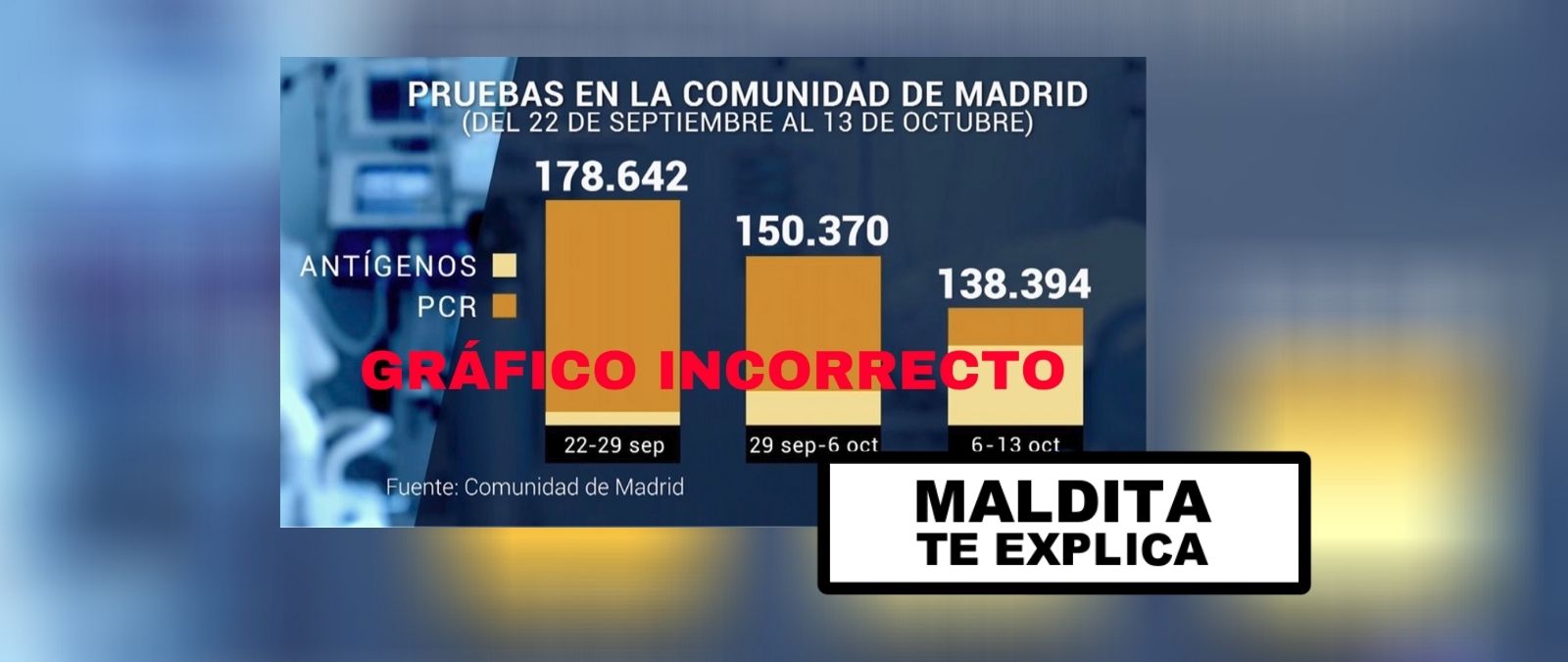 Además, el reportaje donde aparece el gráfico, mientras este se mostraba, la voz narradora explicaba los cambios en la realización de pruebas diagnósticas en la Comunidad de Madrid: “Con los datos que ha hecho públicos en la Comunidad de Madrid vemos que la realización de test de antígenos ha aumentado un 90%, mientras que se hacen dos veces menos PCR. Sumando ambas formas de diagnosticar el número de pruebas ha disminuido un 30% en tres semanas”. Pero estos datos tampoco son correctos.