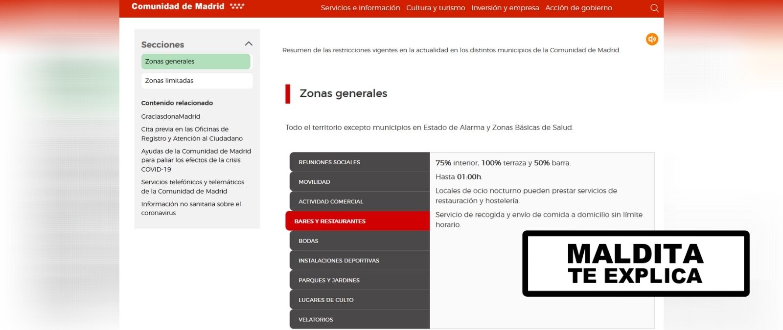 En la web, que se ha bloqueado por la Comunidad de Madrid pero puedes consultar aquí, aparece que en los bares de la Comunidad de Madrid el horario de apertura es hasta la 1:00 h., que el servicio de recogida y envío de comida a domicilio no tiene límite horario y que el aforo máximo es del 75% en el interior, 100% en terrazas y 50% en barra. La normativa vigente a 27 de octubre dice que el horario máximo para bares y restaurantes son las 0:00 horas de la noche, y no pueden permanecer abiertos más tiempo para hacer pedidos a domicilio. Además, los aforos en bares y restaurantes son del 50% tanto en interiores como en terrazas, y el servicio en barra está suspendido.