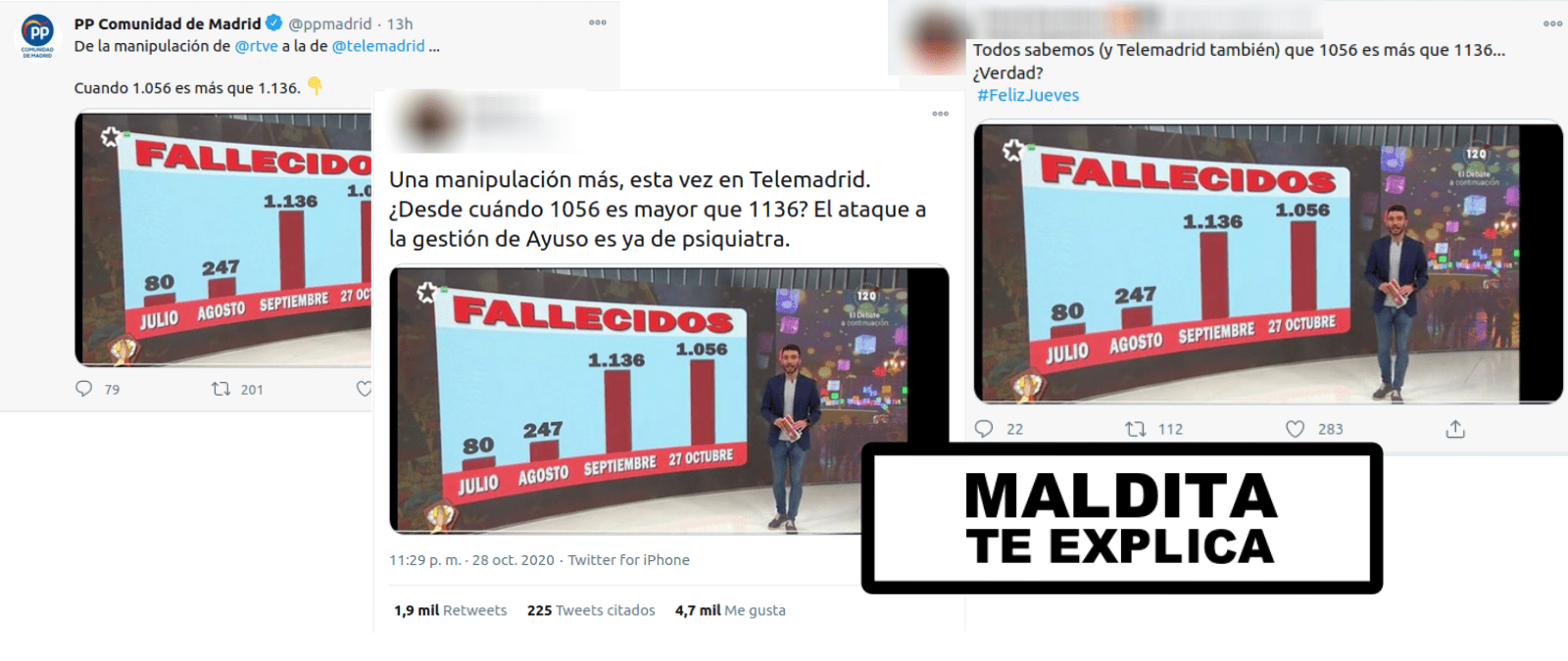 Se ha movido mucho por redes sociales una captura de un programa de Telemadrid en el que aparece un gráfico del número de fallecidos en el que la cifra que corresponde a octubre (hasta el día 27 del mes) tiene una barra más alta que la de septiembre, cuando el número de fallecidos es superior en septiembre según las propias cifras que se muestran en el gráfico. Se ha comentado también que se trata de un gráfico manipulado.