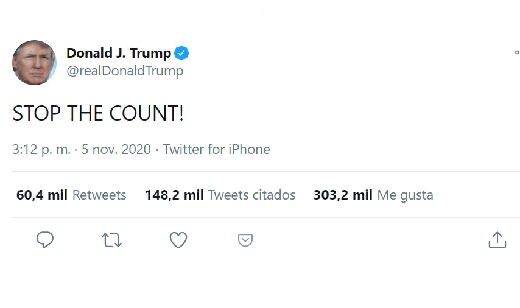 No sabemos si lo que quiere decir Trump es que se detenga el escrutinio solo en los estados donde va ahora mismo ganando o si quiere que se anulen los resultados de varios estados para que ningún candidato llegue a los 270 votos electorales y sea la Cámara de Representantes quien decida el ganador.