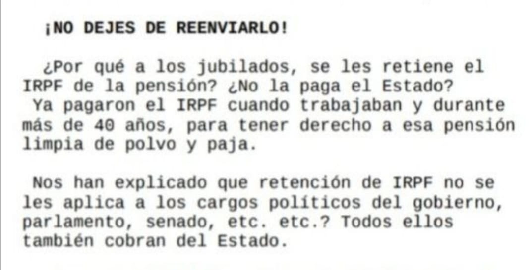 Se difunde en redes sociales y nos habéis hecho llegar a nuestro chatbot de WhatsApp (+34 644 229 319) una imagen que afirma que la retención del impuesto sobre la renta de las personas físicas (IRPF) “no se aplica a cargos políticos del Gobierno, Parlamento, Senado, etc”. A través de la imagen, el pensionista que supuestamente escribe la denuncia pide que “a los jubilados se les aplique el mismo IRPF que a los cargos políticos”.